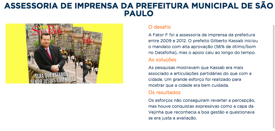 A Fator F se orgulha de seus feitos num portifólio. Um deles é a reportagem de capa da Veja São Paulo sobre a gestão de Gilberto Kassab na prefeitura, que ganhou o título clássico de “Será que estamos sendo justos com ele?”