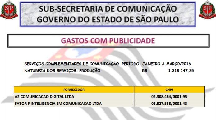 A Fator F é destaque nas planilhas de publicidade do governo Geraldo Alckmin como beneficiária de contratos nos anos de 2010, 2011, 2012, 2013, 2014 e 2016.
