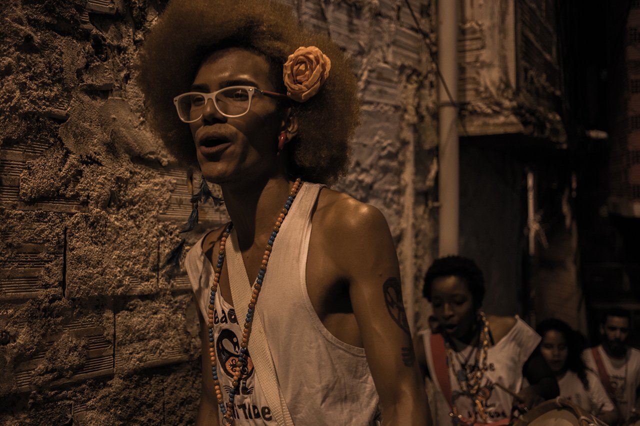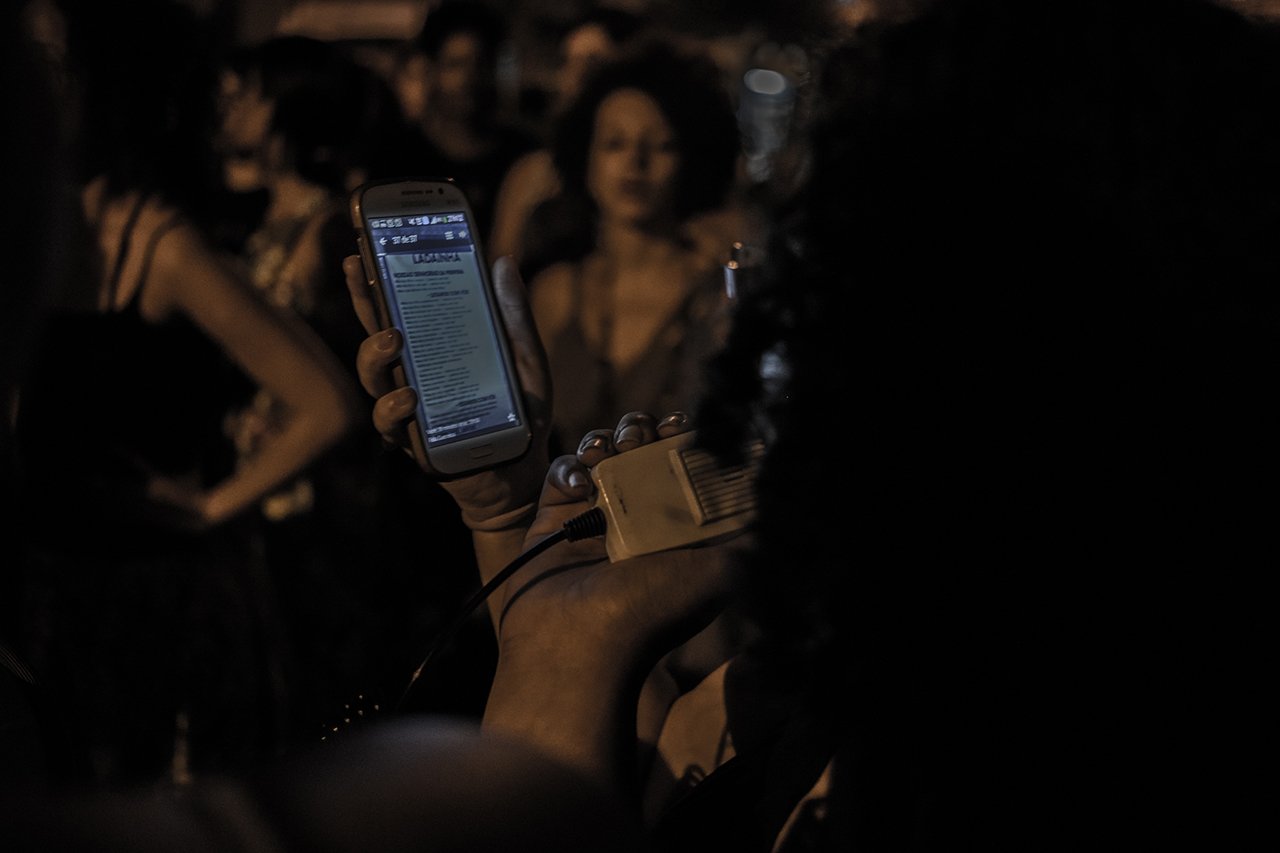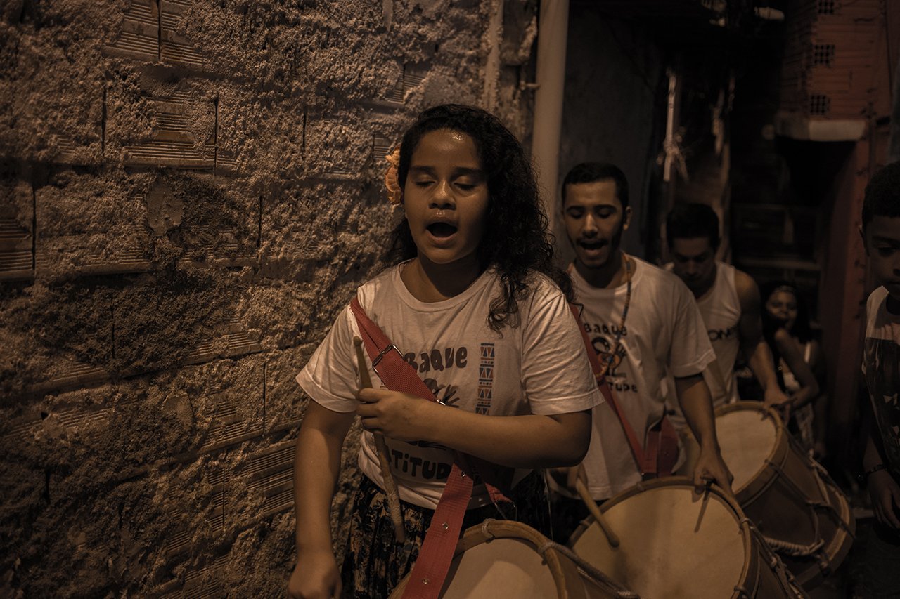 Ao avançar, o batuque fica mais alto e a cantoria mais forte, potente. Nos postes, muros e portões, mulheres negras e periféricas colam os lambe-lambes com dados e frases de protesto contra o machismo e o patriarcado que as atinge todos os dias.